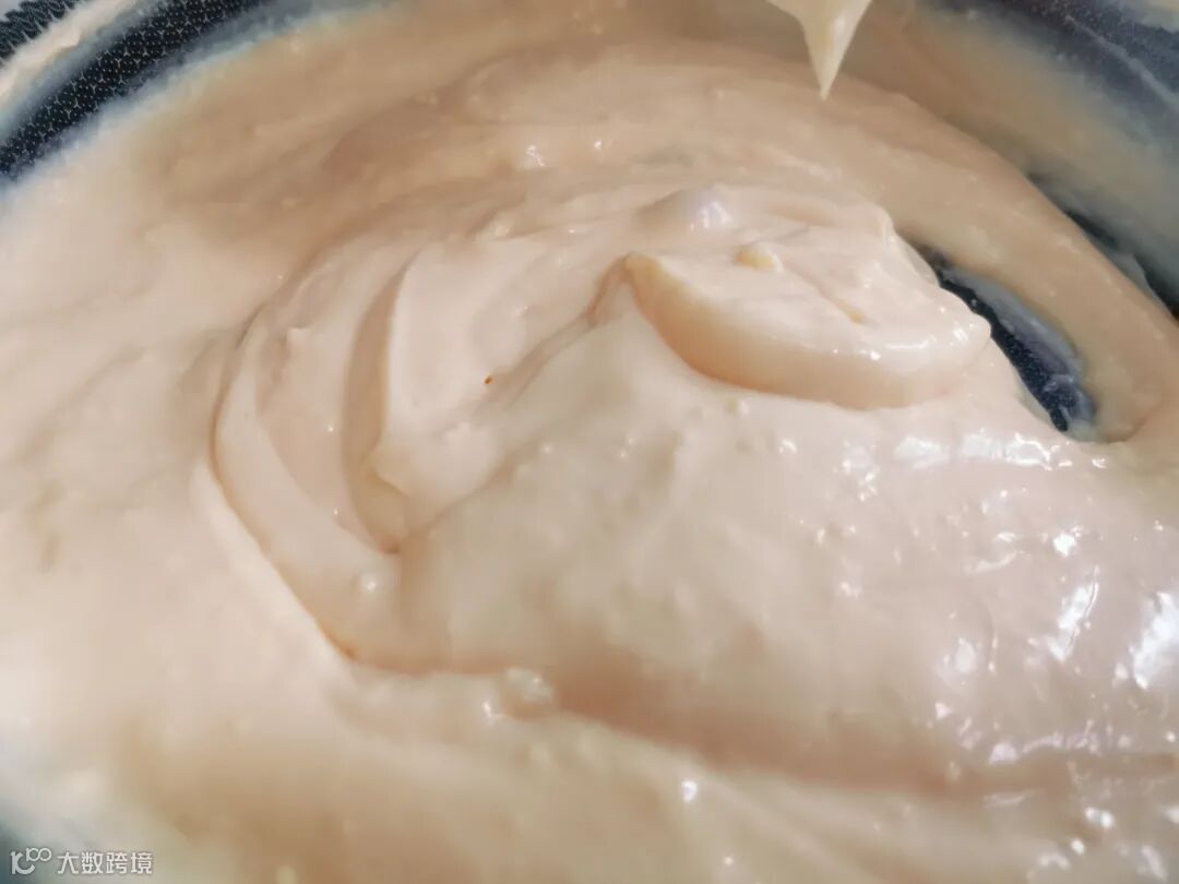 2、搅拌成浓稠的糊状时,会有很多大颗粒出现,这时要稍大力继续搅拌,直到粘稠,但又顺滑无颗粒;