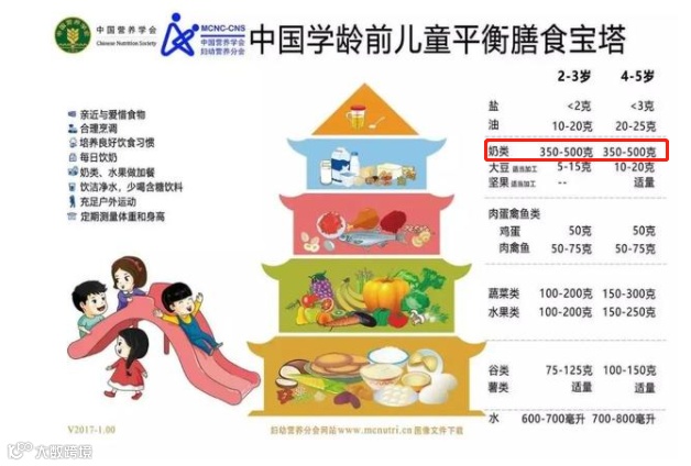 根据中国营养学会给出的《中国学龄前儿童平衡膳食宝塔》可以看出,这个阶段的孩子所需的营养来源是多种多样的,而其中,要求每日饮奶,且需要350-500g/天,所以想要孩子长得高、长得壮、长得好,每天要坚持喝牛奶。