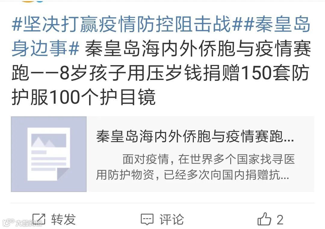 秦皇岛一8岁男童寒假随父亲到意大利,用多年积攒的压岁钱购买防护服和护目镜发往国内抗疫一线;无独有偶,湖北咸宁一8岁男童将6年的压岁钱3.3万元全部捐出,用于前线抗疫。