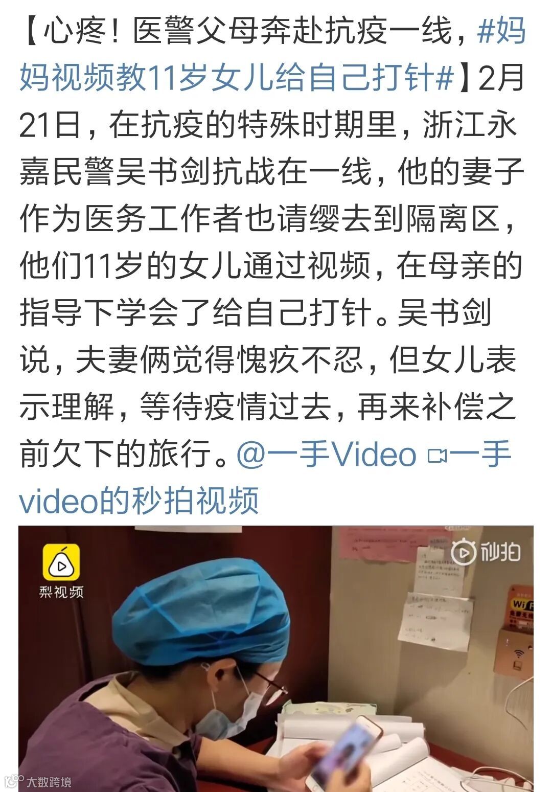 浙江永嘉一对儿夫妻都奋斗在抗疫一线,11岁的女儿由于患病因素需要每天打生长激素,孩子通过与母亲视频,在母亲的指导下学会了给自己打针。