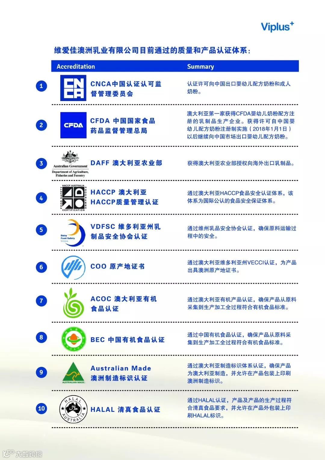 2014年就通过了中国国家认监委工厂注册,2017年率先通过国家婴配粉配方注册制度审核,抢得澳洲婴幼儿奶粉配方注册头号,并连续两年得到澳大利亚乳制品协会(DIAA)的嘉奖, 极大的增强了消费者对维爱佳产品的信赖度。