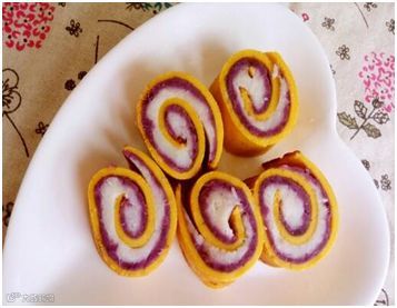 做法:山药、紫薯分开蒸熟搅拌成泥;锅烧热放入适量牛油果油,鸡蛋打散加入虾皮芝麻,倒入锅中,把鸡蛋煎成鸡蛋饼:铺上一层紫薯,再放一层山药。卷起来切块摆盘。