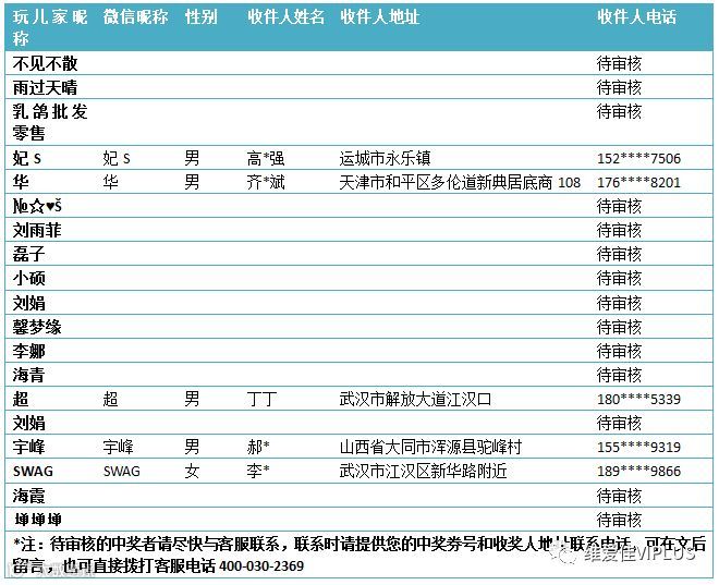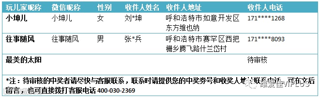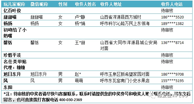 注:中奖名单中所标识的“待审核”为中奖者玩儿家昵称与微信昵称不一致,或未能给客服提供“兑奖码”,或未能提供给客服收件人地址联系电话。请“待审核”的中奖者尽快在本文后留言完善信息或者拨打我们的客服热线400-030-2369告知相关信息,以便我们尽早给您安排派送奖品。若即日起一周内“待审核”中奖人仍未能向我们提供上述信息的,我们将认为您已弃奖。