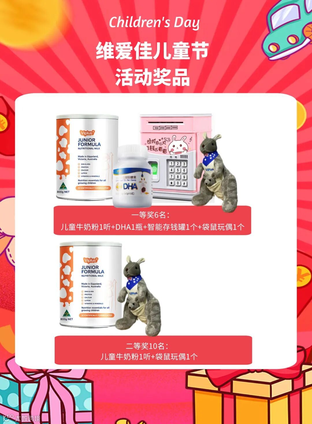 一等奖6名:儿童牛奶粉1听+DHA藻油凝胶糖果1瓶+智能存钱罐1个+袋鼠玩偶1个