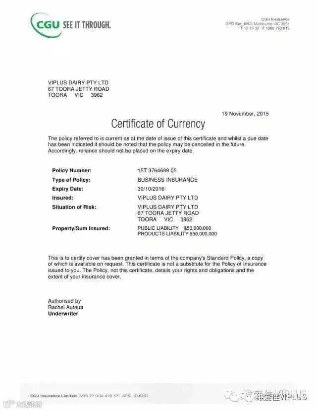 为了在全球消费人群之中建立信心,2017年9月,维爱佳乳业对外宣布,公司通过全球最大的保险公司CGU的严格产品质量风险评估及生产流程审核,对"全球消费者"投保澳币1亿元的产品责任保险(PRODUCTS LIABILITY)和公共责任保险(PUBLIC LIABILITY),折合人民币4.5亿元。