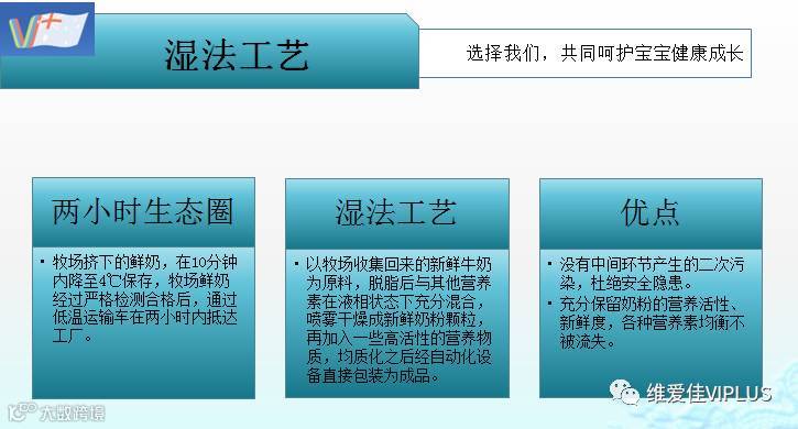 湿法生产的微生物污染机会很小。在鲜乳液态时,将各种营养素调配溶解,在液态状态下喷雾干燥而成,使得营养素均匀化。喷雾造粒一次即可,有利于维生素保持、脂肪的安定同时可预防脂肪氧化。通过湿法工艺生产口感更佳,天然醇香,其溶解度也比干法奶粉要好。
