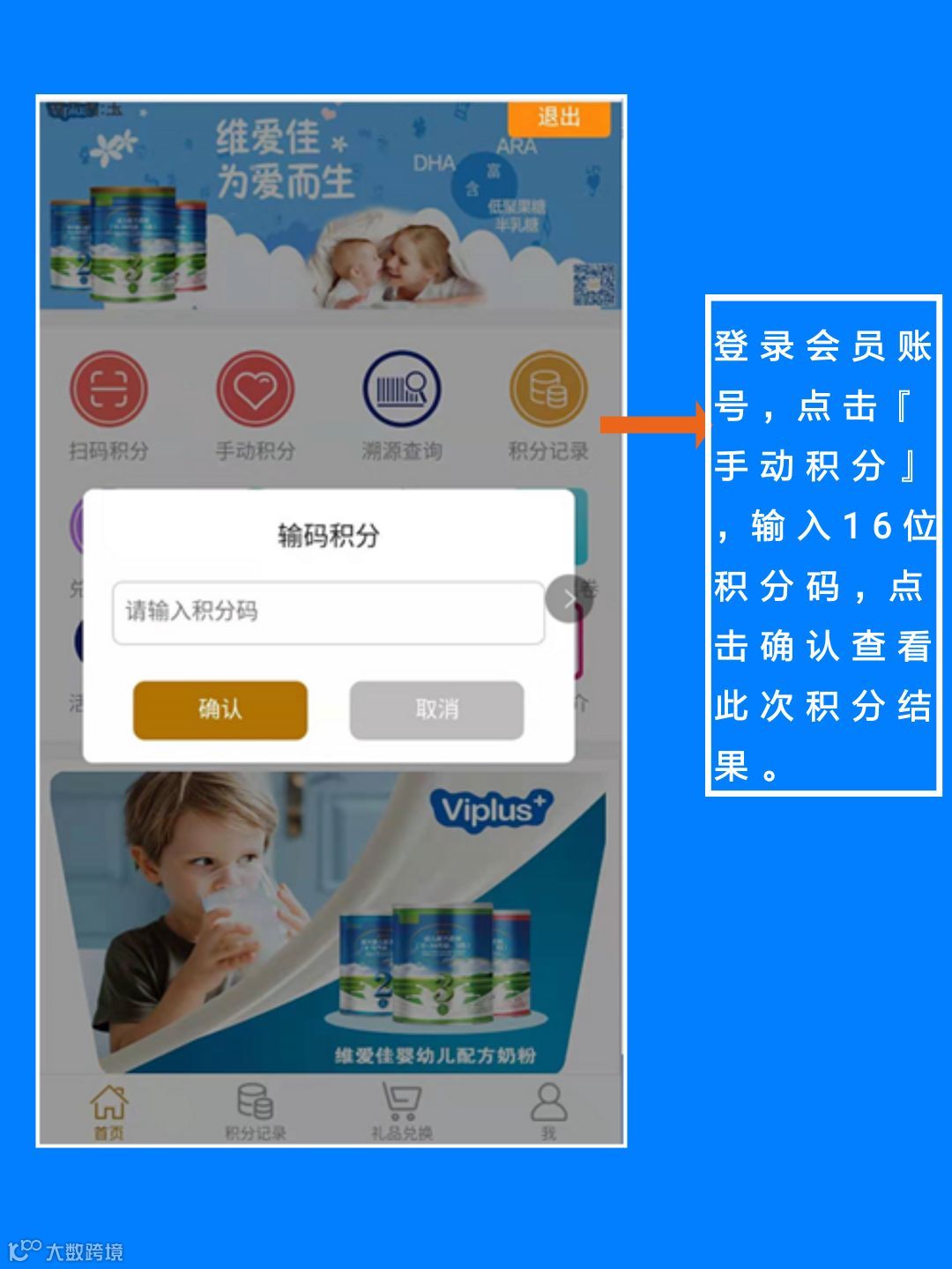 登录会员账号,点击【手动积分】,输入16位积分码,点击确认查看此次积分结果。