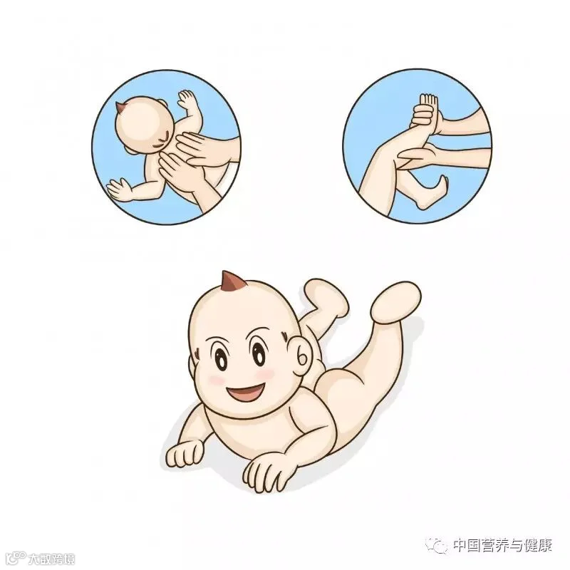 婴儿清醒时或洗澡后,家长帮助婴儿做腿部按摩,用手轻轻拉拉婴儿双腿,使腿部有上下、左右活动,有利于婴儿运动机能的发展。