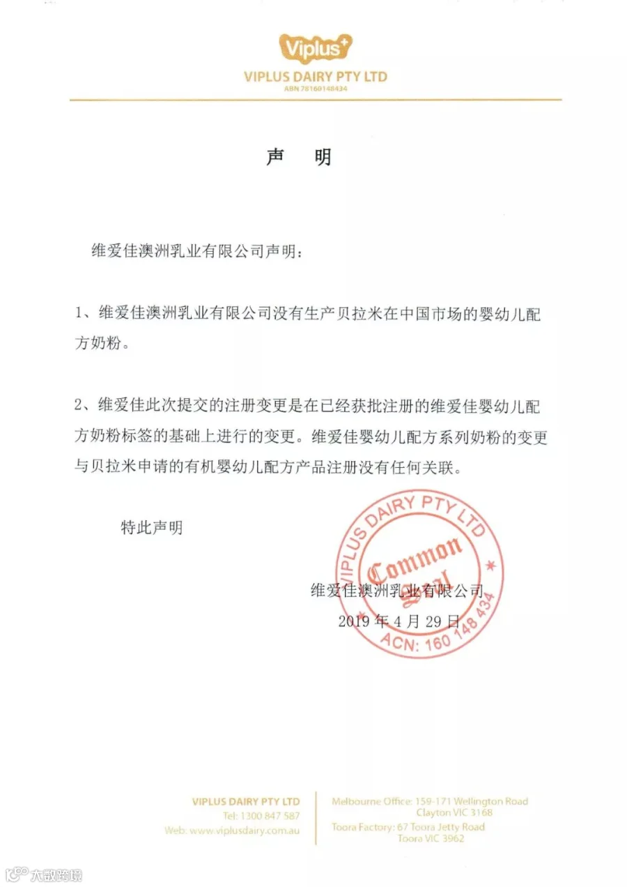 2、 维爱佳此次提交的注册变更是在已经获批注册的维爱佳婴幼儿奶粉标签的基础上进行的变更。维爱佳婴幼儿配方系列奶粉的变更与贝拉米申请的有机婴幼儿配方产品注册没有任何关联。