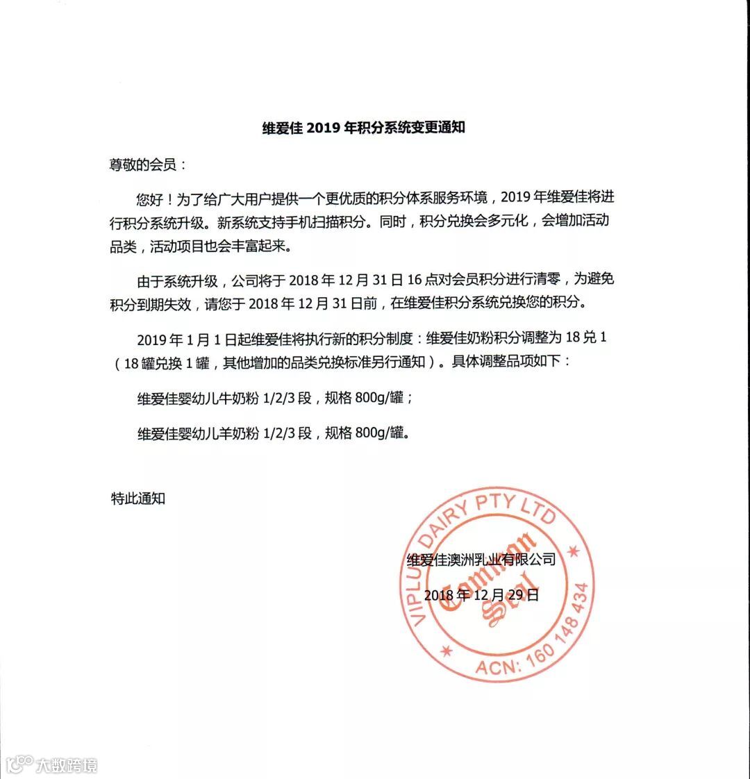 2019年1月1日起维爱佳将执行新的积分制度:维爱佳奶粉积分调整为18兑1(18罐兑换1罐,其他增加的品类兑换标准另行通知)。具体调整品项如下: