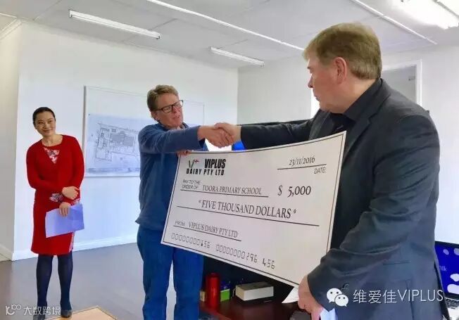 参观后,中澳嘉宾共同见证了维爱佳乳业对当地图拉小学(Toora Primary School)的捐赠仪式。仪式上,维爱佳乳业首席执行官皮特·坎宁安(Peter Cunningham)向图拉小学校长捐赠了5000澳币的现金支票,用于学校为学生们修建操场和相关的活动设施。