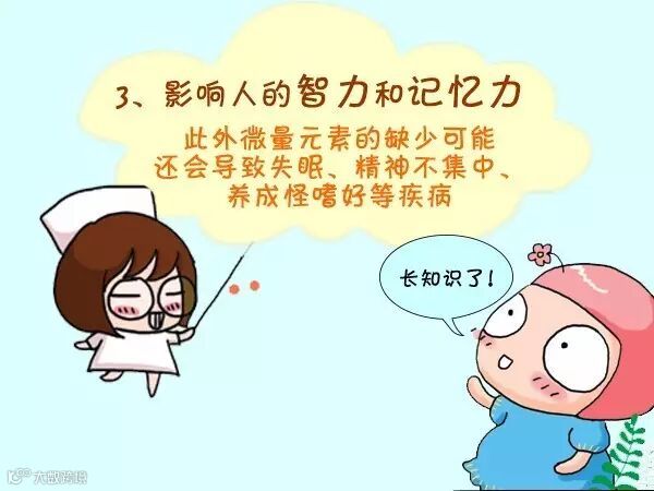 2.锌:孩子缺锌,生长就会缓慢,口腔常常发生溃疡,没有味觉,食欲下降,挑食异食(爱吃土、金属或玻璃等),毛发稀黄等。