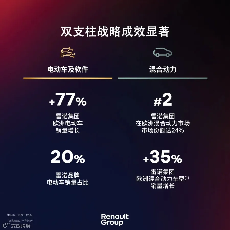 - 欧洲市场:雷诺5(欧洲B级电动车冠军)、雷诺Symbioz(雷诺最畅销的全混动车型)、达契亚Bigster(2025年下半年零售市场C级SUV销量冠军)。