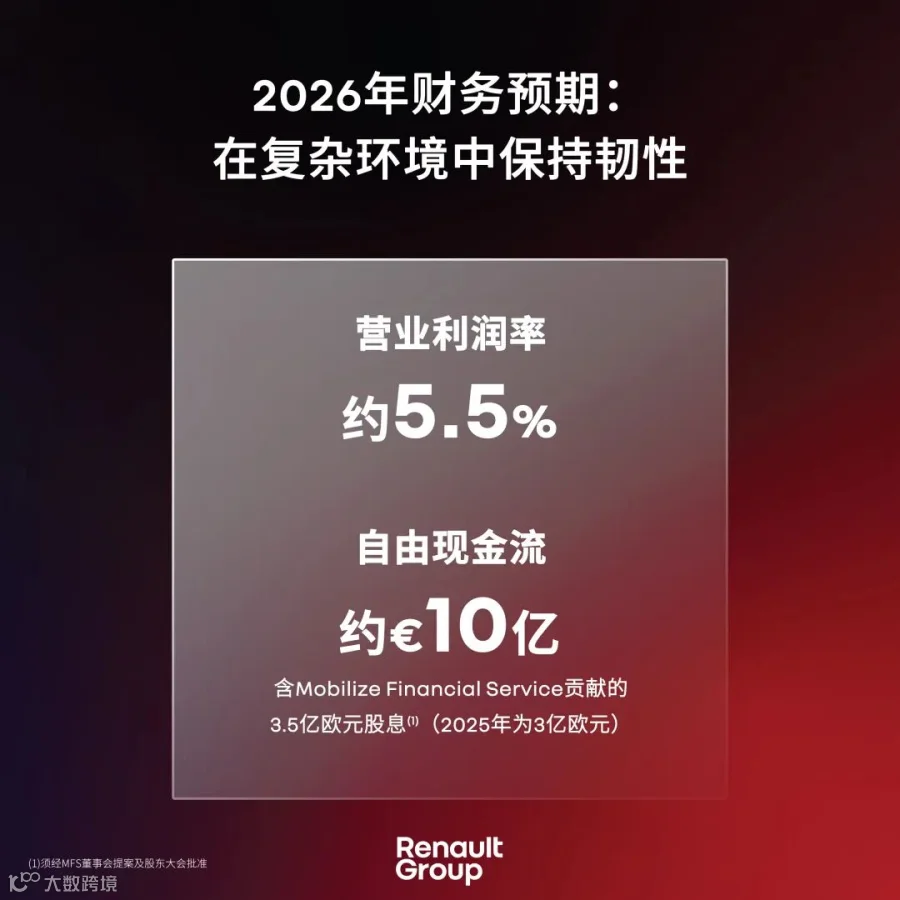 2026年汽车业务自由现金流预计将包括来自Mobilize Financial Services的3.5亿欧元股息(2025年为3亿欧元)。集团预计2026年营运资金需求将出现负向变动,以持续消化2024年底录得的营运资金正向变动。