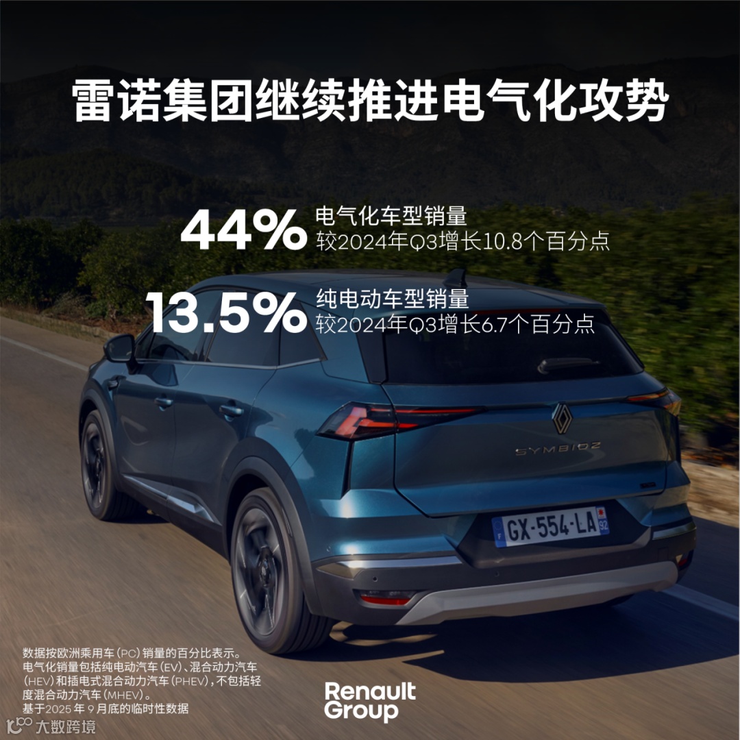 2025年前九个月,雷诺集团电动化车型销量增长58.6%,已占总销量的43.9%。在2025年第三季度,电动化车型占比达到44.0%,较2024年第三季度提升10.8个百分点。