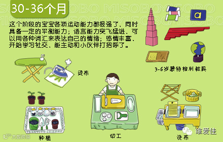 30—36个月:这个阶段的孩子可以独立做切、洗、种植等工作;可以用各种词汇来表达自己的情绪;开始主动和小伙伴们打招呼了