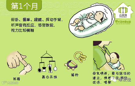 第1个月:俯卧、握拳、蹬腿、挥动手臂、听声音有反应、感官敏锐、视力比较模糊