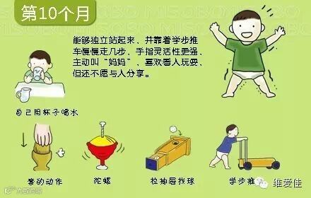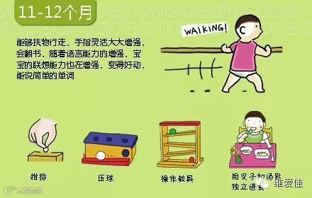 11—12个月:能够扶物行走、手指灵活性大大增强,变得好动,能说简单的单字