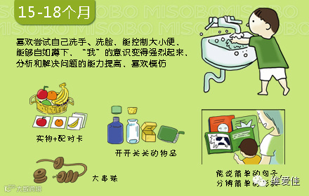 15—18个月:喜欢尝试自己洗手、洗脸、能够自如蹲下,能说简单的句子