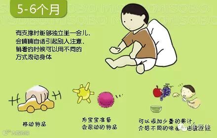 5—6个月:有支撑能够独立坐一会,会喃喃自语引起别人注意,躺着的时候可以用不同的方式滚动身体