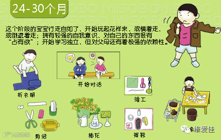 24—30个月:独立穿衣服、折衣服;也可以做些家务,如擦桌子、擦鞋等;语言能力得到进一步提升,可以跟别人展开对话