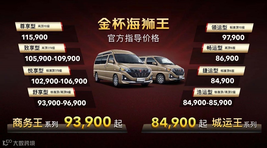 金杯海狮王此次带来了两大系列车型,分别是城运王和商务王两大系列,其中城运王系列售价为84,900元-97,900元,商务王系列售价为:93,900元-115,900元。