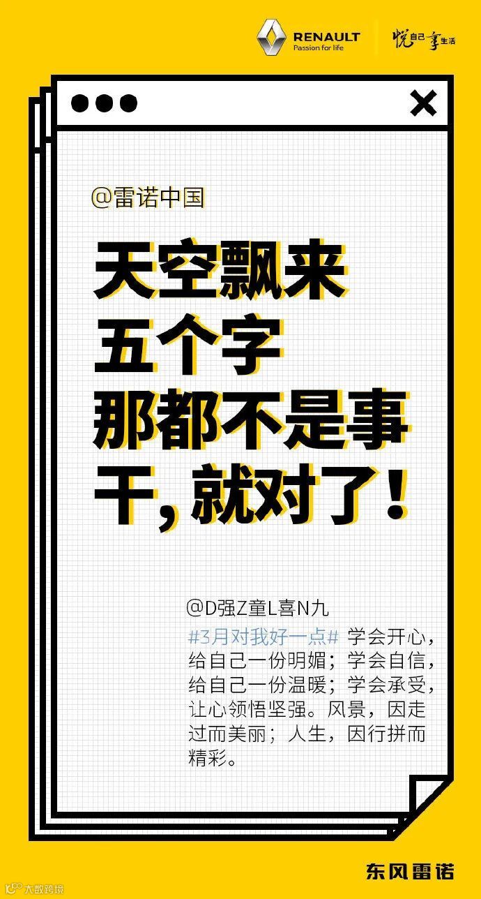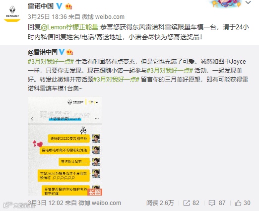 此次#三月对我好一点#活动,我们还为大家准备了精美礼物,留言点赞最多的网友将获得雷诺精品车模一台。