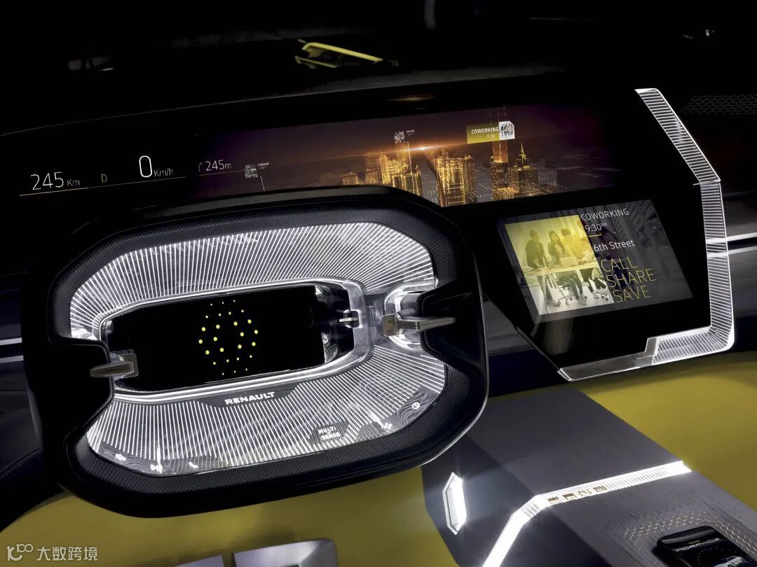 这款车有一个具有未来感的方向盘,中央带有一个10.2英寸的显示屏,显示主要的驾驶和安全信息。在方向盘后面,是一个环绕式仪表板,看起来这款车似乎没有真正意义上的仪表板和多媒体屏幕。
