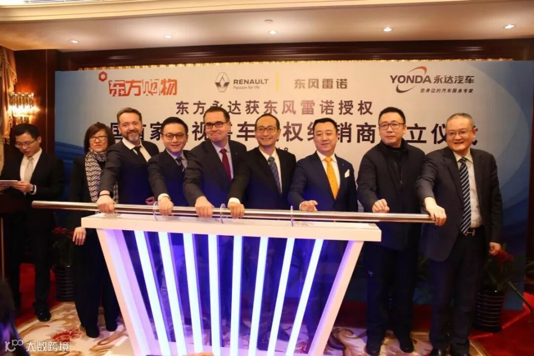 1月8日,中国首家电视售车授权经销商成立仪式在上海举行。东风雷诺、东方购物、永达汽车计划在东方购物电视平台上开展汽车经销和品牌推广合作。