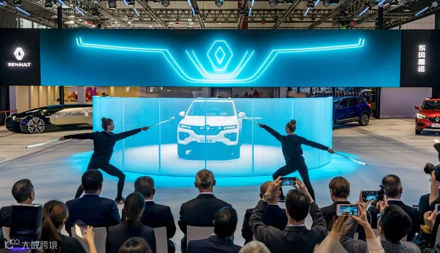 五名国际舞蹈演员身着炫酷的黑衣登上舞台,手持蓝色的荧光棒。在激动人心、富有节奏的音乐声中,他们排成阵营,将手中的荧光棒在空中灵活自如地挥舞。旋转变幻的光圈像蝴蝶,像花朵,又像飞动的车轮,演绎着都市绚烂的色彩。音乐停下,半圆的屏幕徐徐拉开,在人们期待的目光中, Renault City K-ZE 于4月16日在上海车展进行了全球首秀。
