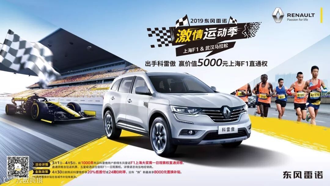 最美人间四月天,没有三月的寒五月的燥,正值百花竞放争相斗妍,热闹非凡。东风雷诺以2019东风雷诺武汉马拉松和上海F1大奖赛为契机,携手国产明星双车——科雷嘉与科雷傲重磅出击,打造“东风雷诺激情运动季”,彰显“Passion for life”的品牌主张和“挑战现状”的品牌精神,为广大消费者带来元气满满的激情四月。