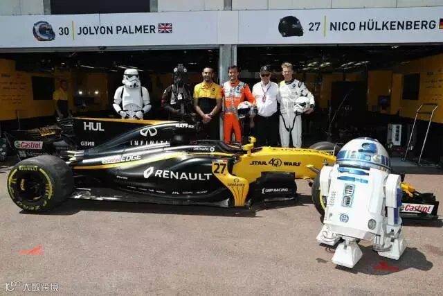 两者的惺惺相惜则出现在2017年5月的摩纳哥,当雷诺运动车队庆祝征战F1赛场40周年时,多位星球大战人物也盛装出席,雷诺的F1赛车还印上STAR WARS 40年的标志,R2-D2机器人也踱到车边上,一睹赛车的强劲动力。