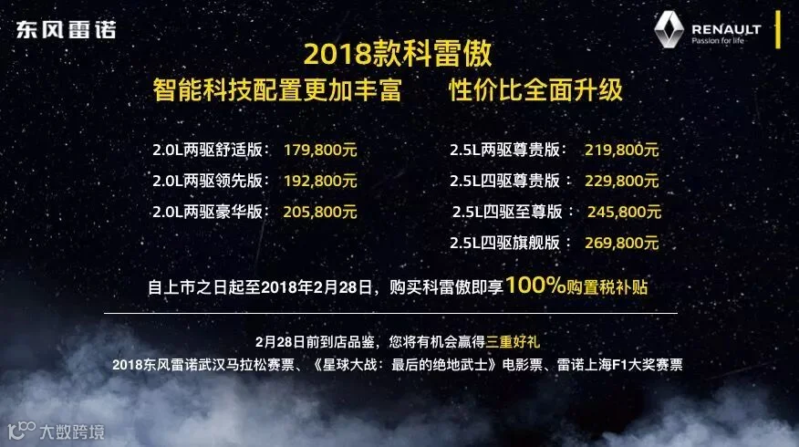 2018款科雷傲官方建议零售价17.98万元-26.98万元,新车共计推出7款车型,新增“双维智联系统”及外后视镜自动折叠等多项高度智能化配置,“创新人性科技”更进一步。同时,从即日起至2月28日,购买2018款科雷傲即可享受“100%购置税补贴” ,性价比全面升级,为消费者提供更为精致的人车生活,诠释欧系SUV的独特魅力。