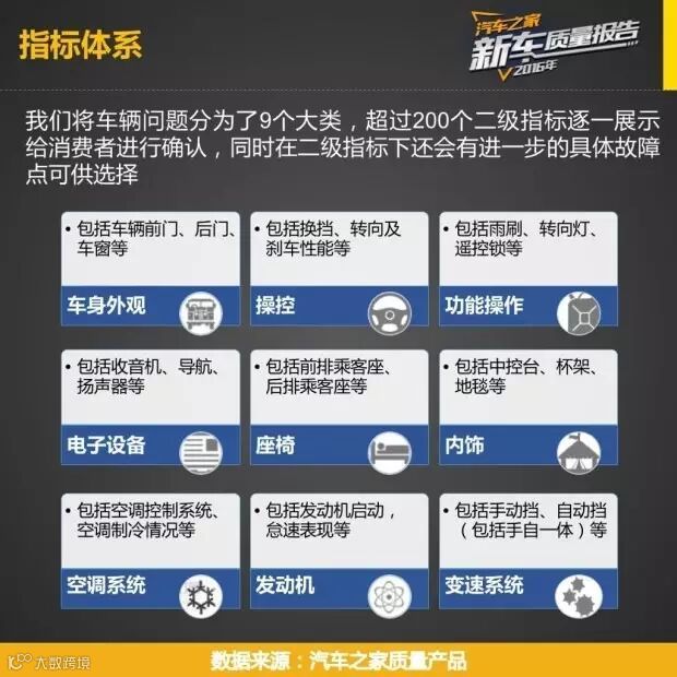 昨天,汽车之家发布的《2016年乘用车新车质量报告》吸引了各大车企、媒体和车迷朋友的广泛关注。本次调研对象是54483位真实车主(车主新车拥有期都在2-12个月内)。调研内容包括车身外观、操控、功能操作、发动机、变速箱等在内的9大类问题,超过200个二级指标逐一展示给消费者进行评价和确认,保证了结果的权威性、真实性。