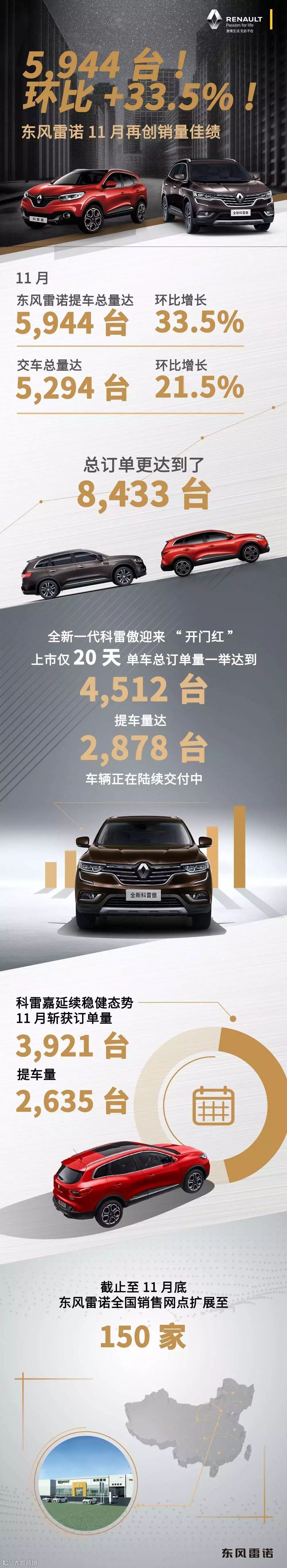 全新一代科雷傲与科雷嘉组成国产“双擎”,拉动东风雷诺全速起航,不断实现销量“可持续”增长。随着产品线布局的不断完善,东风雷诺市场占有率、品牌美誉度等均取得快速提升。与此同时,东风雷诺稳步拓展全国销售网络,截止至11月底,销售网点成功扩展至150家,为年底冲刺增添了更多可能。