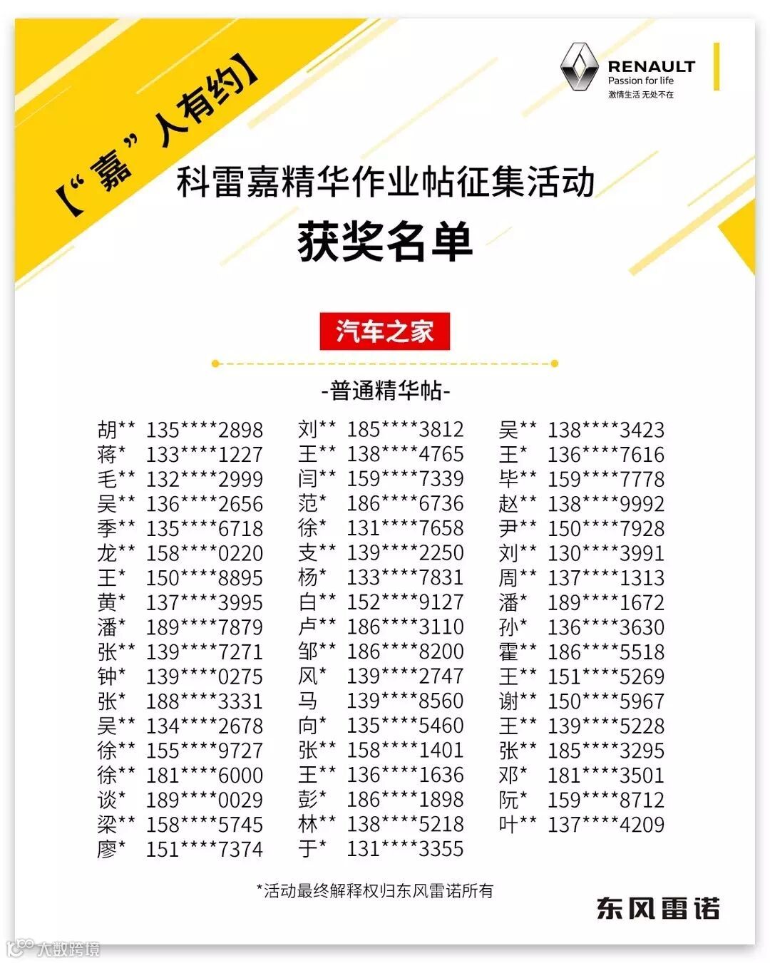 2、其中,2个获奖小伙伴(汽车之家ID号:lucaskwok、Thinking1988),由于提供的信息不全,我们无法联系,请看到获奖名单后尽快与我们联系。