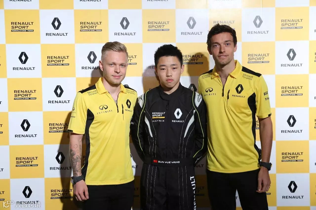 中国卡丁车新星孙越扬与两位雷诺F1车队车手合影