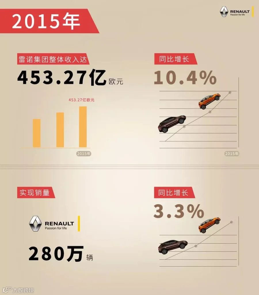 近日,雷诺集团公布了2015年财报。报告显示,雷诺集团2015年整体收入高达453.27亿欧元,同比增长10.4%;雷诺汽车实现销量280万辆,同比增长3.3%。