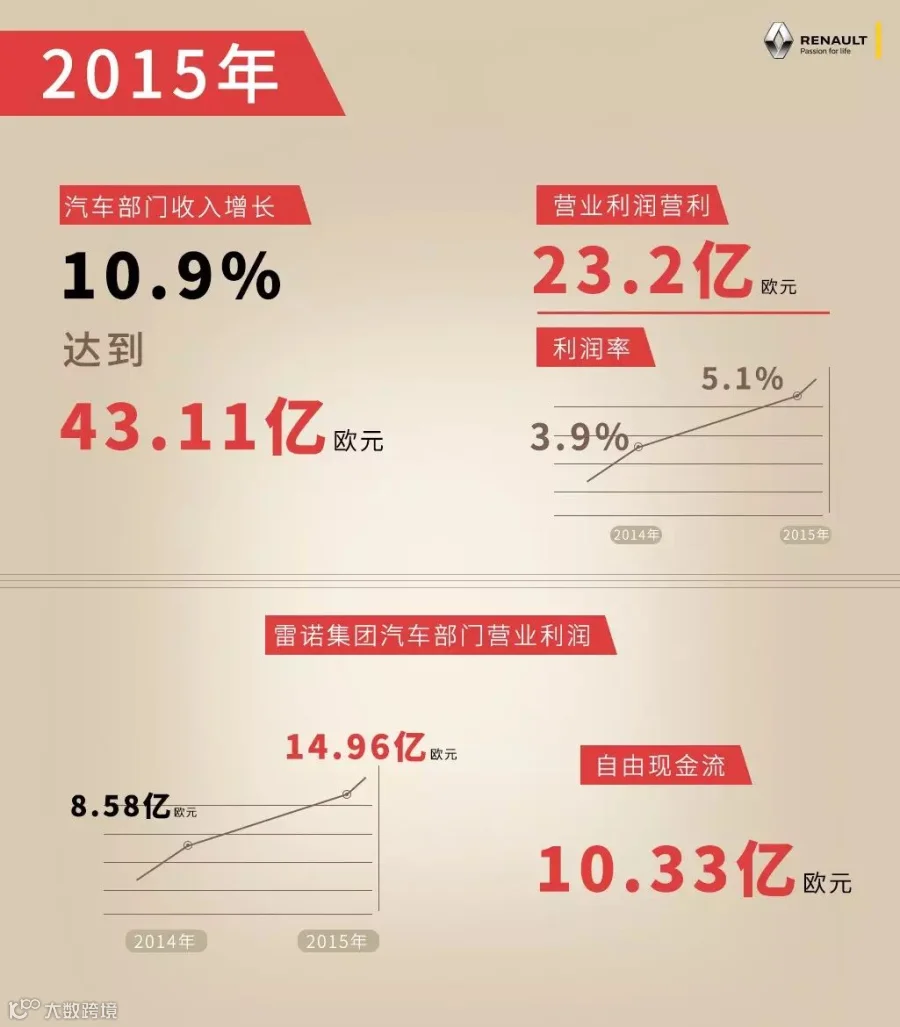 其中,汽车部门收入增长10.9%,达到43.11亿欧元;营业利润方面,雷诺集团营利23.2亿欧元,利润率从2014年的3.9%提高到5.1%。同时,雷诺集团汽车部门营业利润由2014年的8.58亿欧元攀升至14.96亿欧元,自由现金流变为10.33亿欧元。