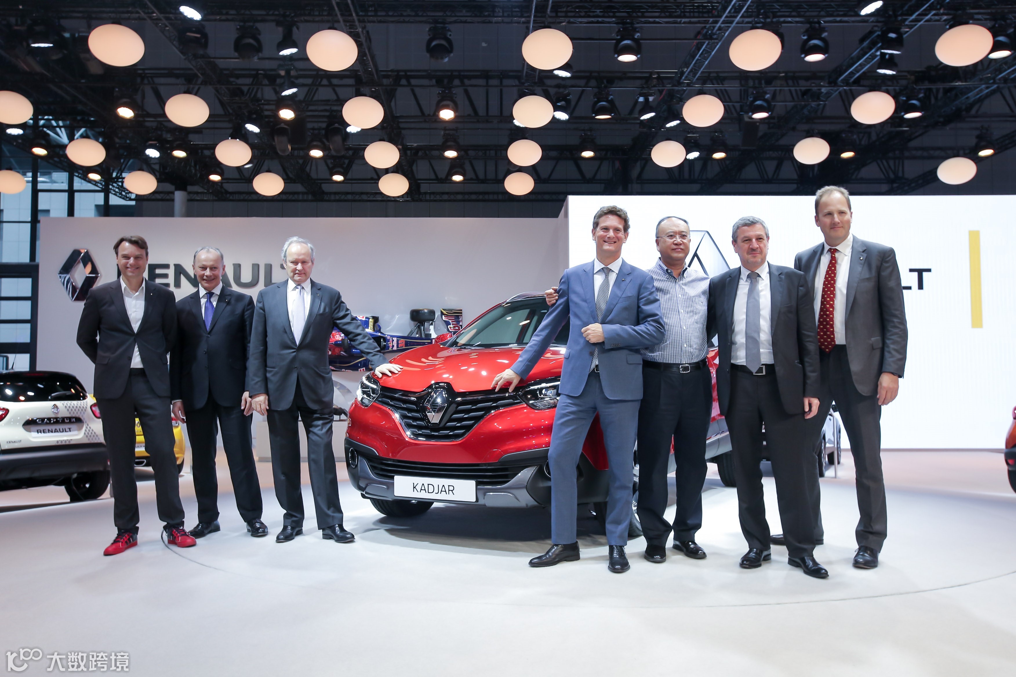 雷诺设计高级副总裁劳伦斯•范•登•阿艾克先生;雷诺首席竞争官、执行副总裁蒂埃里•波洛雷先生;雷诺首席绩效官、销售与市场营销执行副总裁杰罗姆•斯托尔先生;雷诺高级副总裁、亚太区总裁罗吉乐先生;东风雷诺汽车有限公司执行副总裁胡信东先生;雷诺高级副总裁、东风雷诺汽车有限公司总裁达业先生;雷诺营销高级副总裁Michael van der SANDE先生合影留念(从左至右)