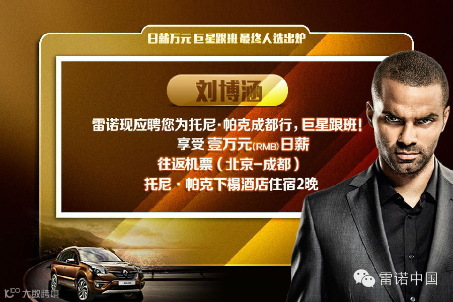 雷诺集团经过微博、微信网友点赞投票,托尼·帕克雷诺行“日薪万元 巨星跟班”人选最终敲定。