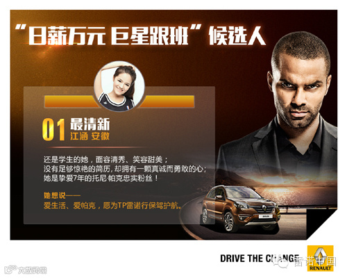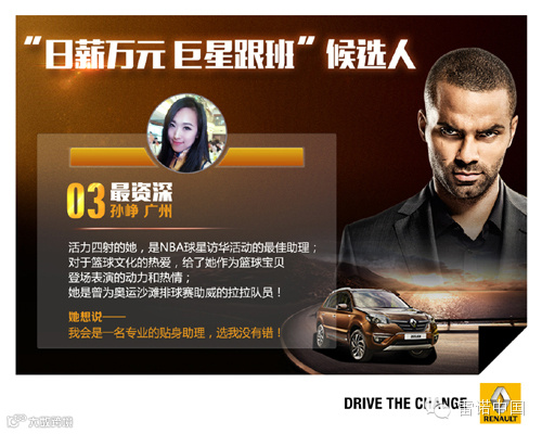 获得选票最多的选手,最终将被雷诺中国录取,成为托尼·帕克8月30日雷诺行,最牛兼职助理!