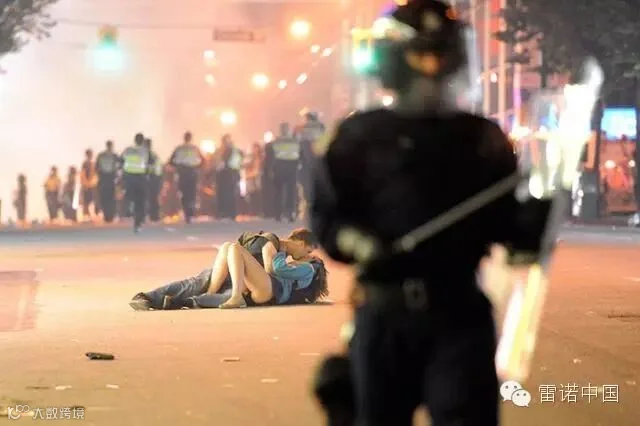 2011年6月16日,加拿大温哥华爆发冰球球迷骚乱中,一名男子用亲吻,安慰受伤的女友,浪漫的温情与周遭紧张气息形成强烈对比。这张华裔摄影师理查德·林无意中拍下的吻照,被称为“温哥华骚乱之吻”,红遍网络,受到无数人追捧。