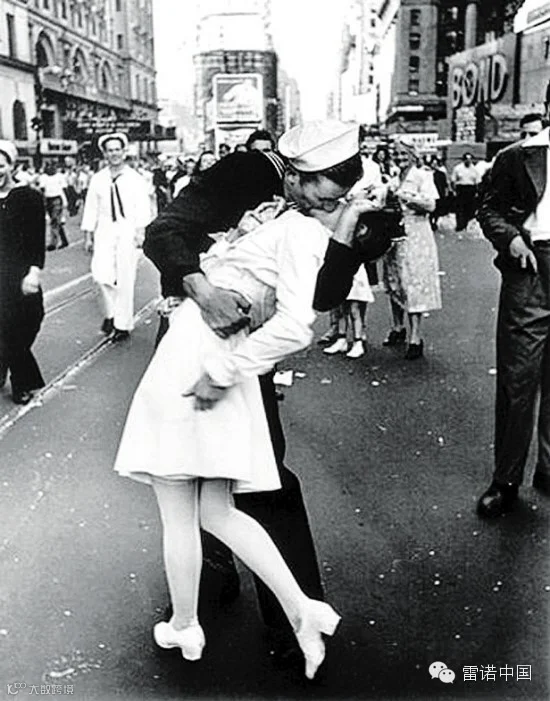 另一载入史册的吻,拍摄于1945年的纽约时代广场。时值日本政府宣布无条件投降,一名水兵抑制不住心中的喜悦,忘情拥吻身边的陌生女护士。抓拍下这一刻的摄影师阿尔弗雷德·埃森施泰特,将之命名为“胜利之吻”,而这张照片也成为象征二战胜利的传世经典。