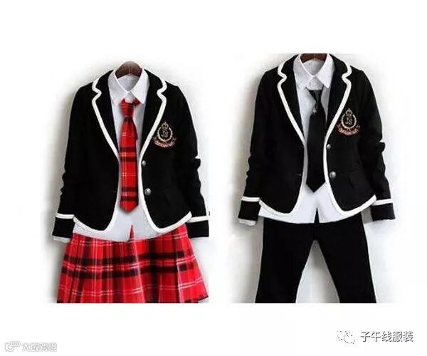 采用经典的西服样式校服,红色的领带和西装外套,充满着精英的气质。