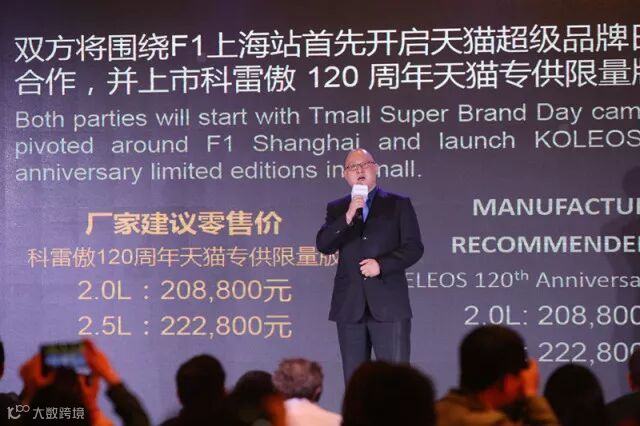 目前,雷诺天猫旗舰店已正式上线。天猫LOGO已经出现在雷诺运动F1车队赛车的车头位置。东风雷诺还专门为天猫众多的线上消费者推出科雷傲120周年天猫专供限量版,东风雷诺市场销售副总裁兼东风雷诺市场销售部部长陈曦宣布,科雷傲天猫专供限量版车型今天正式上市,2.0L版价格为20.88万元,2.5L版价格为22.28万元。