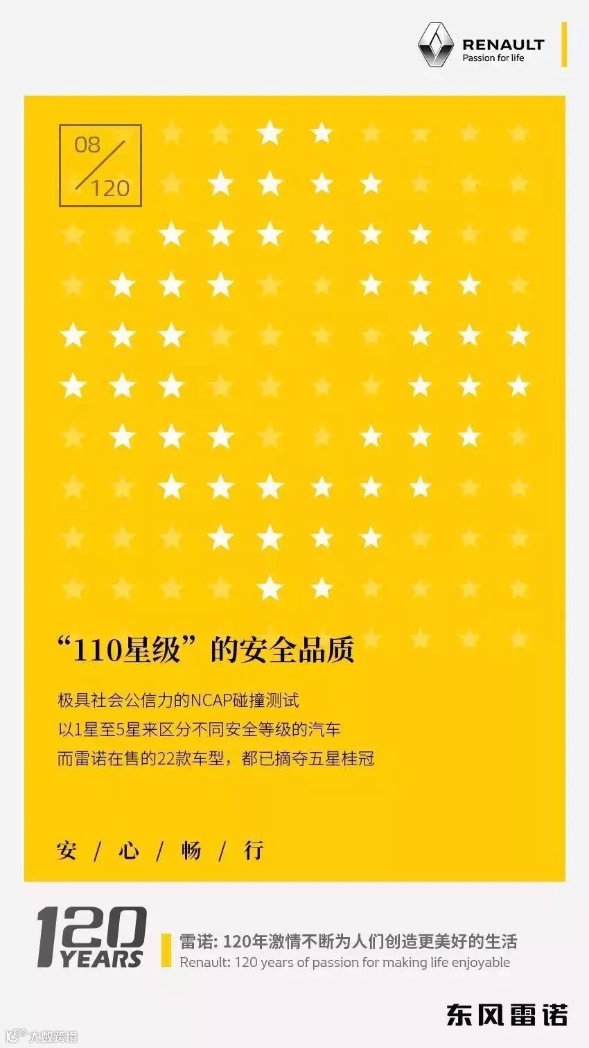 不论是1/4世纪以来对节能减排技术的探索,亦或者成立道路安全研究中心,还是以其高超的造车工艺制造出高品质的汽车,且雷诺在售的22款车型在NCAP碰撞测试中全部摘夺五星桂冠。正如在120周年系列海报中所说的,120年以来雷诺始终在激情不断地为人们创造更美好的生活。