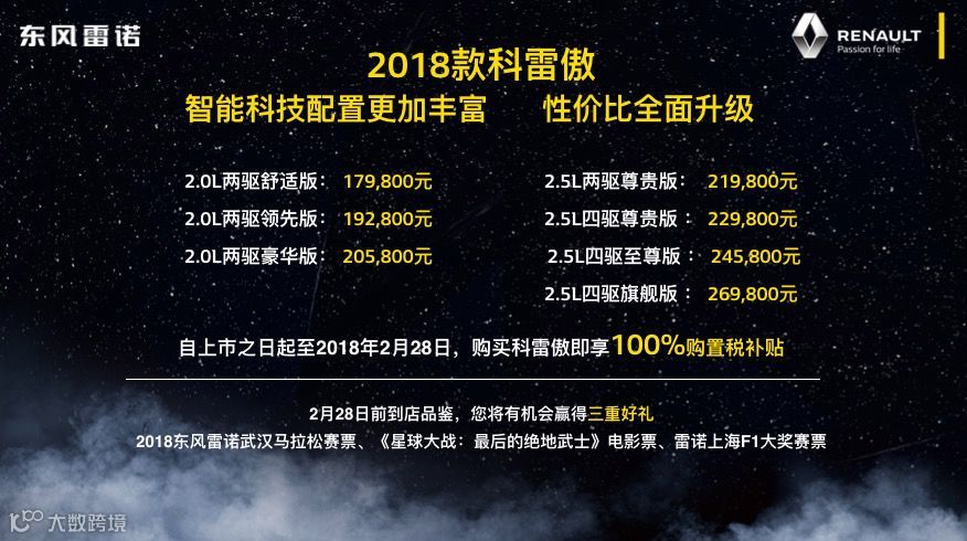 注:自上市之日起至2月28日,购买2018款科雷傲即可享受“100%购置税补贴”。 |