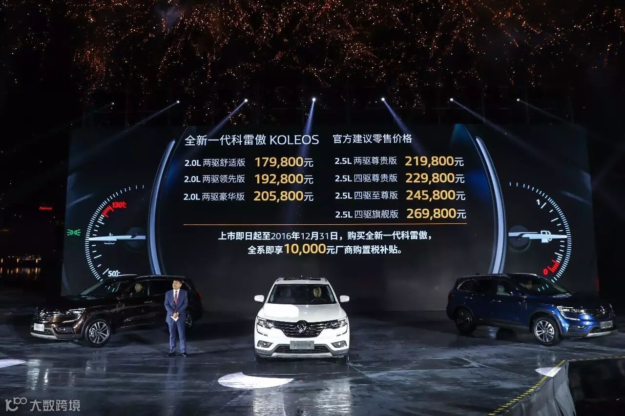 2016年11月10日,在充满梦幻科技与艺术气息的深圳水秀剧场,东风雷诺全新一代科雷傲魅力上市!这款雷诺全球旗舰SUV,率先于德法等欧洲主流市场登陆中国,充分凸显雷诺对中国市场的高度重视与期待。全新一代科雷傲共推出两个排量7款车型,售价17.98万元-26.98万元。此外,东风雷诺还同步推出诚意大礼,上市即日起至2016年12月31日,购买全新一代科雷傲,全系享1万元 厂商购置税补贴。