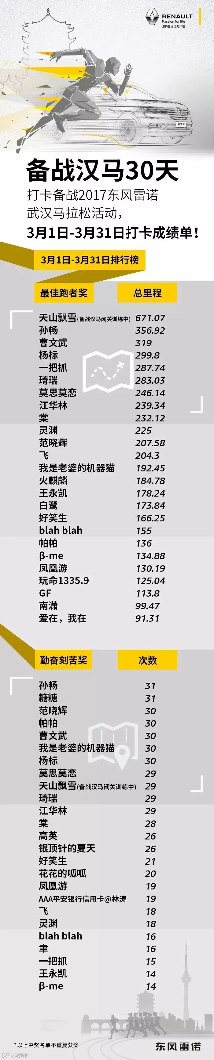 2、打卡备战,2017东风雷诺武汉马拉松的中奖者,将分别获得由东风雷诺提供的1:18全新一代科雷傲车模一台。奖品会在近期寄出,请耐心等待。